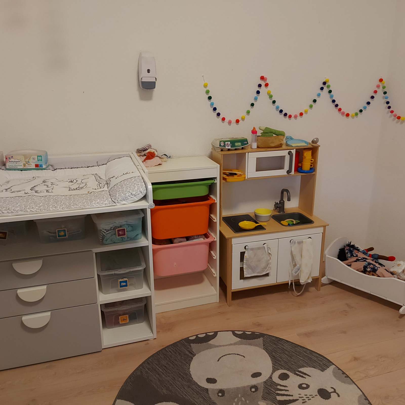 Kinder haben besondere Bedürfnisse an die Einrichtung: Ein Wickeltisch steht im Schlafraum. Für den Mittagsschlaf oder um sich auszuruhen gibt es ein großes Bodenbett. Die Küche ist besonders wichtig: hier bereiten wir – auch oft gemeinsam mit den Kindern – die Mahlzeiten zu und lassen es uns zusammen am großen Tisch schmecken. In den Räumen gibt es verschiedene Bereiche zum Basteln oder Spielen – mache Bereiche werden auch für verschiedene Anlässe umgeräumt.